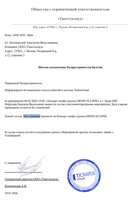 Уважаемый клиент! Спешим сообщить, что по информации, полученной от организатора, спектакль «Фальшивая нота», запланированный на 5 января 2025 года в 18:00 в Театре имени Ленсовета, заменён на спектакль «Синьор из высшего общества». Ранее приобретенные билеты действительны на новый спектакль, обменивать их не нужно. Если новый спектакль вам не подходит, вы можете вернуть билет по кнопке в личном кабинете во вкладке «Заказы». Деньги за электронные билеты вернутся автоматически в полном объёме на карту, с которой была произведена оплата. Если вы купили билет в кассе Ticketland.ru за наличный расчет, то обратитесь, пожалуйста, на почту: vozvrat@ticketland.ru. С уважением, команда поддержки Ticketland.
