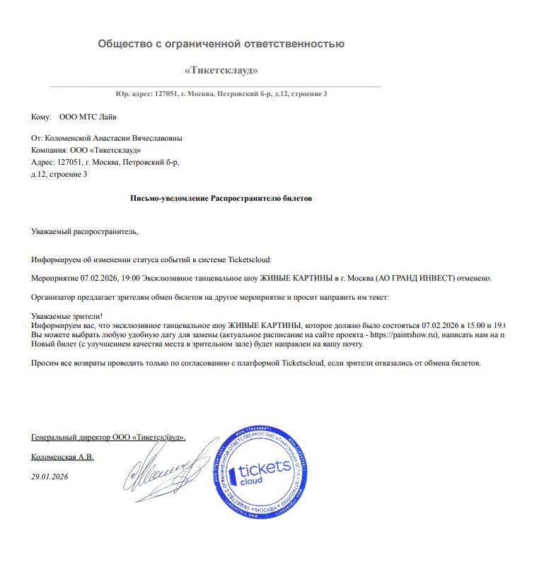 Уважаемый клиент! Спешим сообщить, что по информации, полученной от организатора, эксклюзивное танцевальное шоу «Живые картины», запланированное на 7 февраля 2026 года в 19:00 в Театральном центре «На Плющихе», отменено. Организатор предлагает зрителям обмен билетов на другое мероприятие.Вы можете выбрать любую удобную дату для замены (актуальное расписание на сайте проекта – paintshow.ru), написать нам на почту: ticket@grand-production.ru, приложив ваш билет.Новый билет (с улучшением качества места в зрительном зале) будет направлен на вашу почту. По вопросам возвратов, пожалуйста, обращайтесь к Организатору мероприятия на почту: ticket@grand-production.ru. С уважением, команда поддержки Ticketland